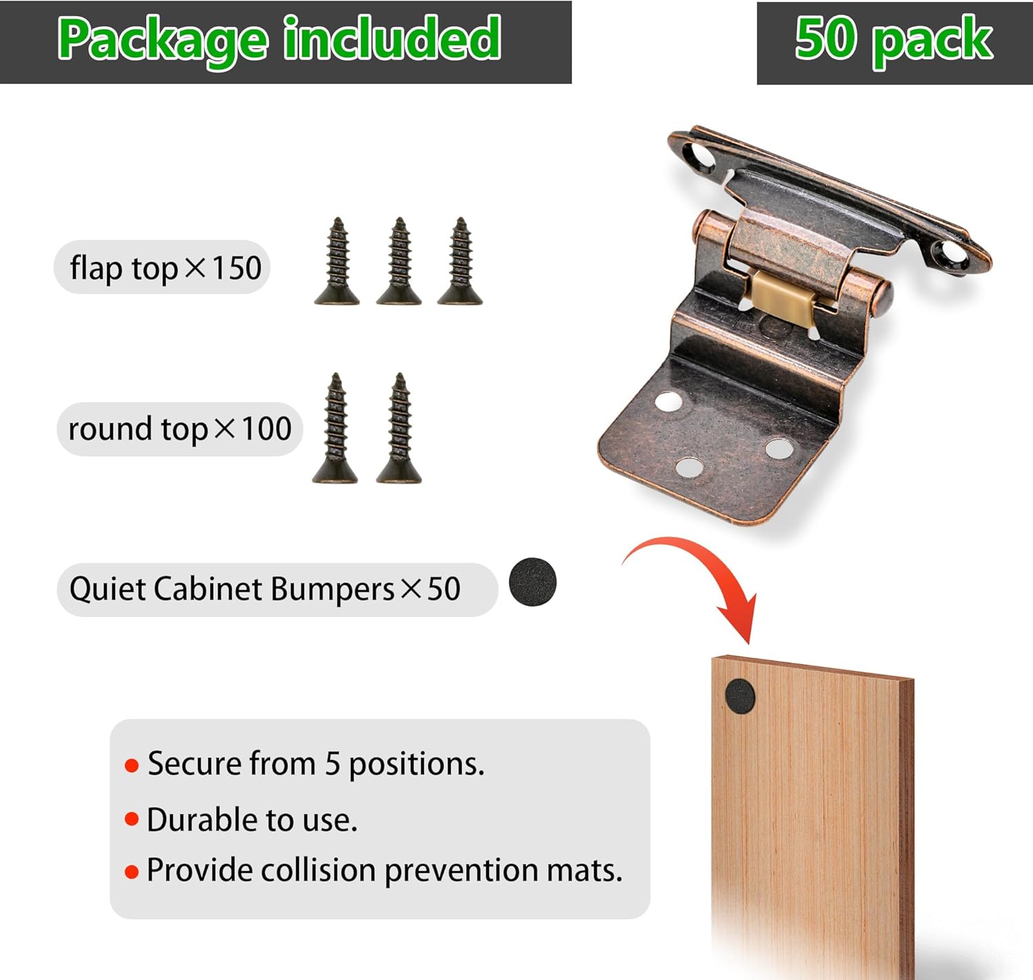 | Included Components | 50 Pack Cabinet hinges, Screw, Shim |