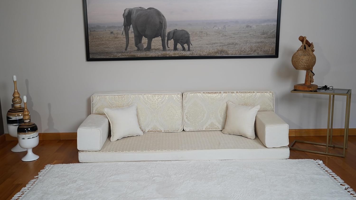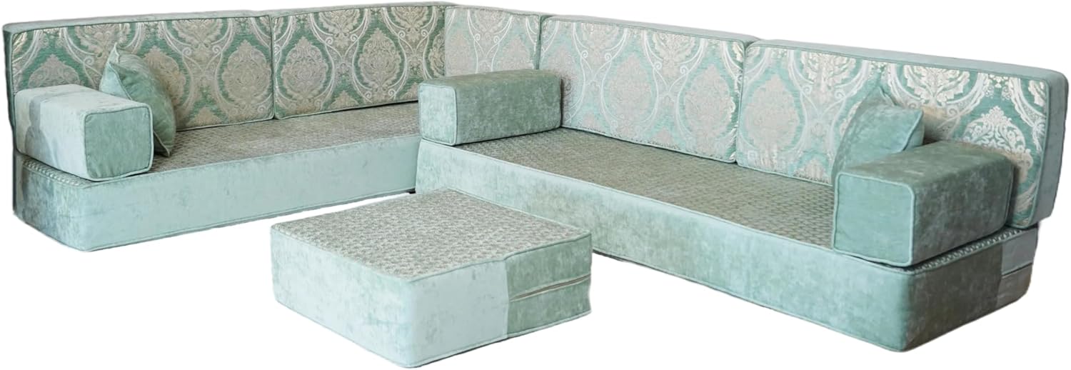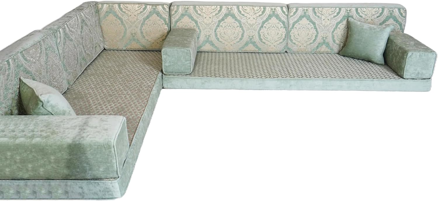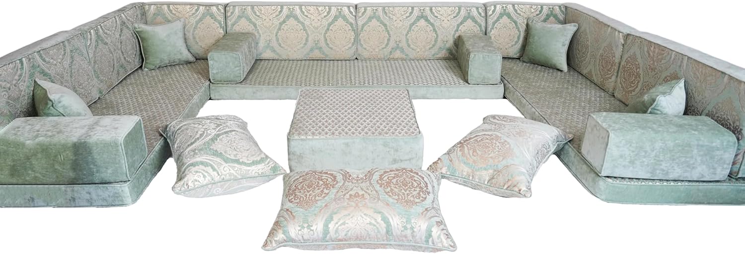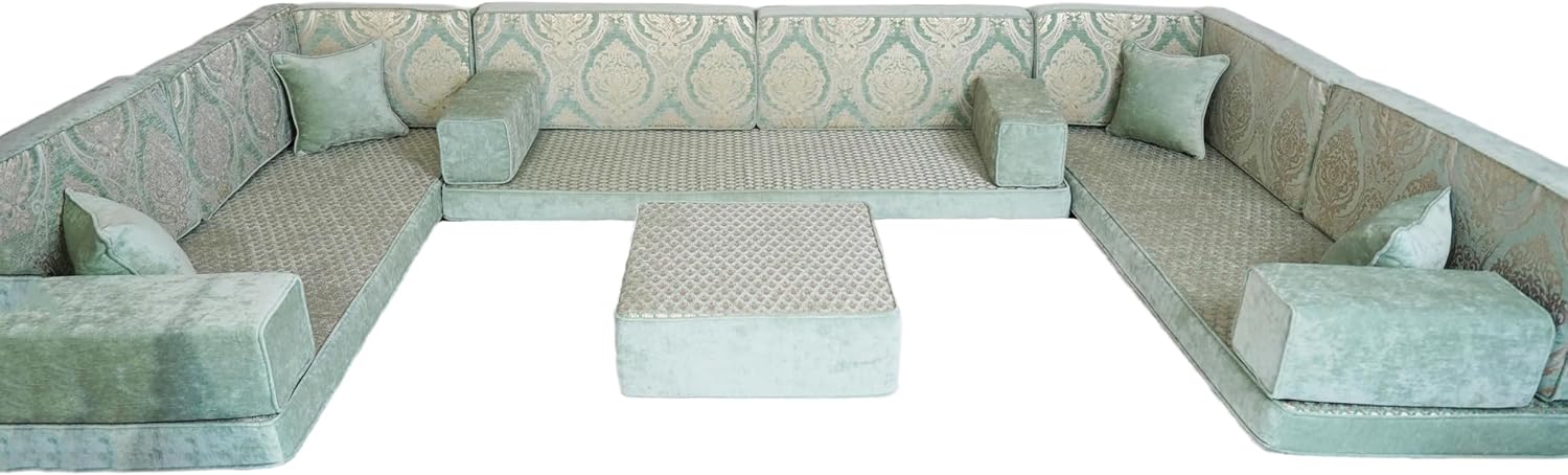 Bring elegance and comfort to your home with our Traditional Arabic Majlis Floor Sofa Set. Perfectly designed for floor seating, our handmade sofas embody the timeless beauty of Arabic furniture. Inspired by classic jalsa and majlis seating styles, this versatile floor couch offers a cozy and luxurious addition to your living room or lounge. The high-quality craftsmanship and luxurious cushions ensure comfort and durability, while the traditional Arabic design adds cultural touch to any space. You will receive products in the variant you selected from the listing page. If you choose 'U Sofa Full Set’ you will get these: -3 Floor Seating Cushions (190 x 70 x 10 cm / 75 x 27 x 4 inch) -6 Backrest Pillows (95 x 40 x 10 cm / 37 x 16 x 4 inch) -2 Backrest Pillows (60 x 40 x 10 cm / 24 x 16 x 4 inch) -3 Pouf Pillows (70 x 50 cm / 27 x 20 inch) -3 Armrest Pillows (50 x 20 x 20 cm / 20 x 8 x 8 inch) -1 Matching Rug (120 x 180 cm / 47 x 71 inch) -1 Ottoman Couch (60 x 60 x 10 cm / 23 x 23 x 4 inch)This sofa set comes in 19 separate pieces. If you choose 'L Sofa Full Set’ you will get these: -2 Floor Seating Cushions (190 x 70 x 10 cm / 75 x 27 x 4 inch)-4 Backrest Pillows (95 x 40 x 10 cm / 37 x 16 x 4 inch)-1 Backrest Pillows (60 x 40 x 10 cm / 24 x 16 x 4 inch)-2 Armrest Pillows (50 x 20 x 20 cm / 20 x 8 x 8 inch)-1 Matching Rug (120 x 180 cm / 47 x 71 inch)-1 Ottoman Couch (60 x 60 x 10 cm / 23 x 23 x 4 inch)-3 Pouf Pillows (70 x 50 cm / 27 x 20 inch)This sofa set comes in 14 separate pieces. If you choose 'Single Sofa Full Set’ you will get these: -1 Floor Seating Cushions (190 x 70 x 10 cm / 75 x 27 x 4 inch)-2 Backrest Pillows (95 x 40 x 10 cm / 37 x 16 x 4 inch)-2 Armrest Pillows (50 x 20 x 20 cm / 20 x 8 x 8 inch)-1 Matching Rug (120 x 180 cm / 47 x 71 inch)-1 Ottoman Couch (60 x 60 x 10 cm / 23 x 23 x 4 inch)-3 Pouf Pillows (70 x 50 cm / 27 x 20 inch)This sofa set comes in 10 separate pieces.The thickness of the cushion will be according to the variant you selected from the listing page.