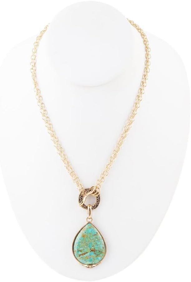 Elevate your style with our Abby Turquoise and Bronze Pendant Necklace. Carefully crafted by hand, this genuine turquoise and bronze piece has a turquoise stone set in a bronze bezel and hangs from a bronze chain with a toggle closure for adjustable length up to 40 inches. An elegant and sophisticated combination, with a pendant measuring 1.5" by 1.2" and a weight of 1.21 oz. It’s a stunning accessory that truly stands out.First mined more than 6,000 years ago, turquoise has been used throughout the ages for worship and as a powerful talisman, capable of safeguarding and bringing happiness to its wearer. Ancient cultures, including the Greeks, Romans and Mayans were all enthralled by its unparalleled color. The color of turquoises strongly dependent on the presence of either copper, which produces the more blue variety, oriron, which produces the more green.Natural variances are part of the beauty of our genuine stones. Your piece will vary slightly from the image shown.