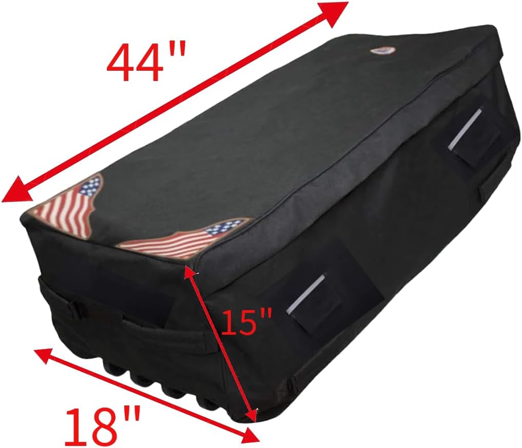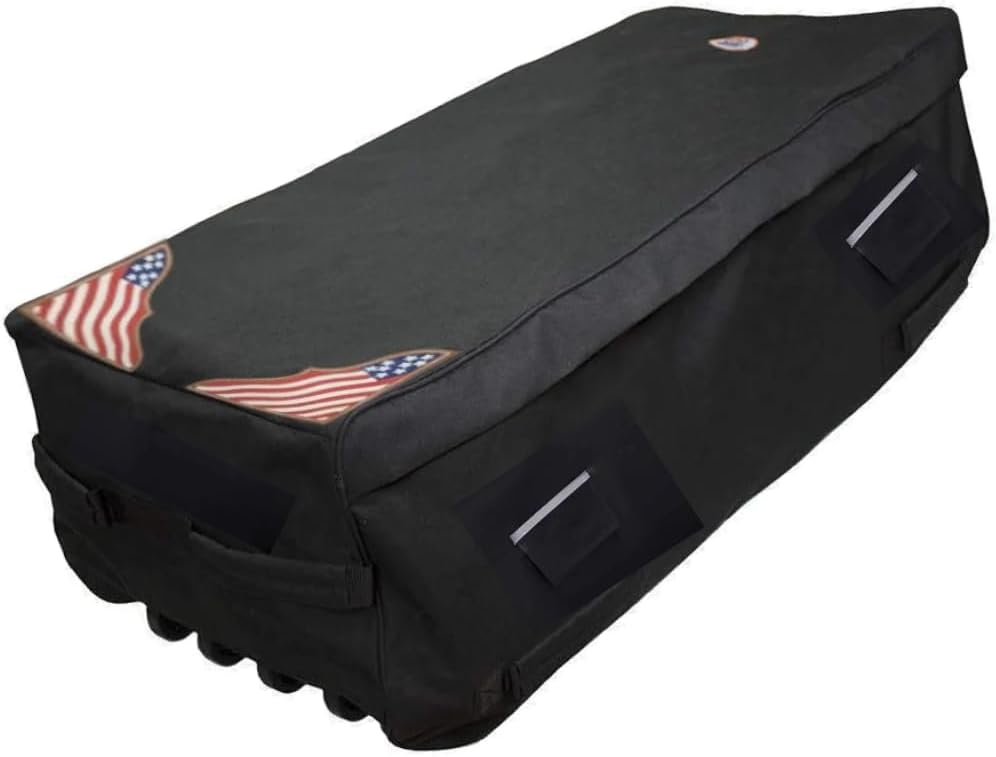 Derby Originals’s Patriotic American Flag 1200D Waterproof Rolling Hay Bale Bag is our newest and most premium bale bag. This bale bag has 5 heavy-duty wheels on one end to make transporting hay easier than ever. Simply pick up the bag using one of our comfortable padded carry handles, and you can wheel your bag around like a suitcase. Our bale bags measure 44x18x15." It can hold an entire 2-string or square bale of hay. These stunning bale bags also feature a pair of hand-tooled leather accents at the bottom corners that depict the American flag. Our hay bale bags are made with extra sturdy 1200D nylon and are backed by a one-year limited manufacturer’s warranty that protects against quality defects.