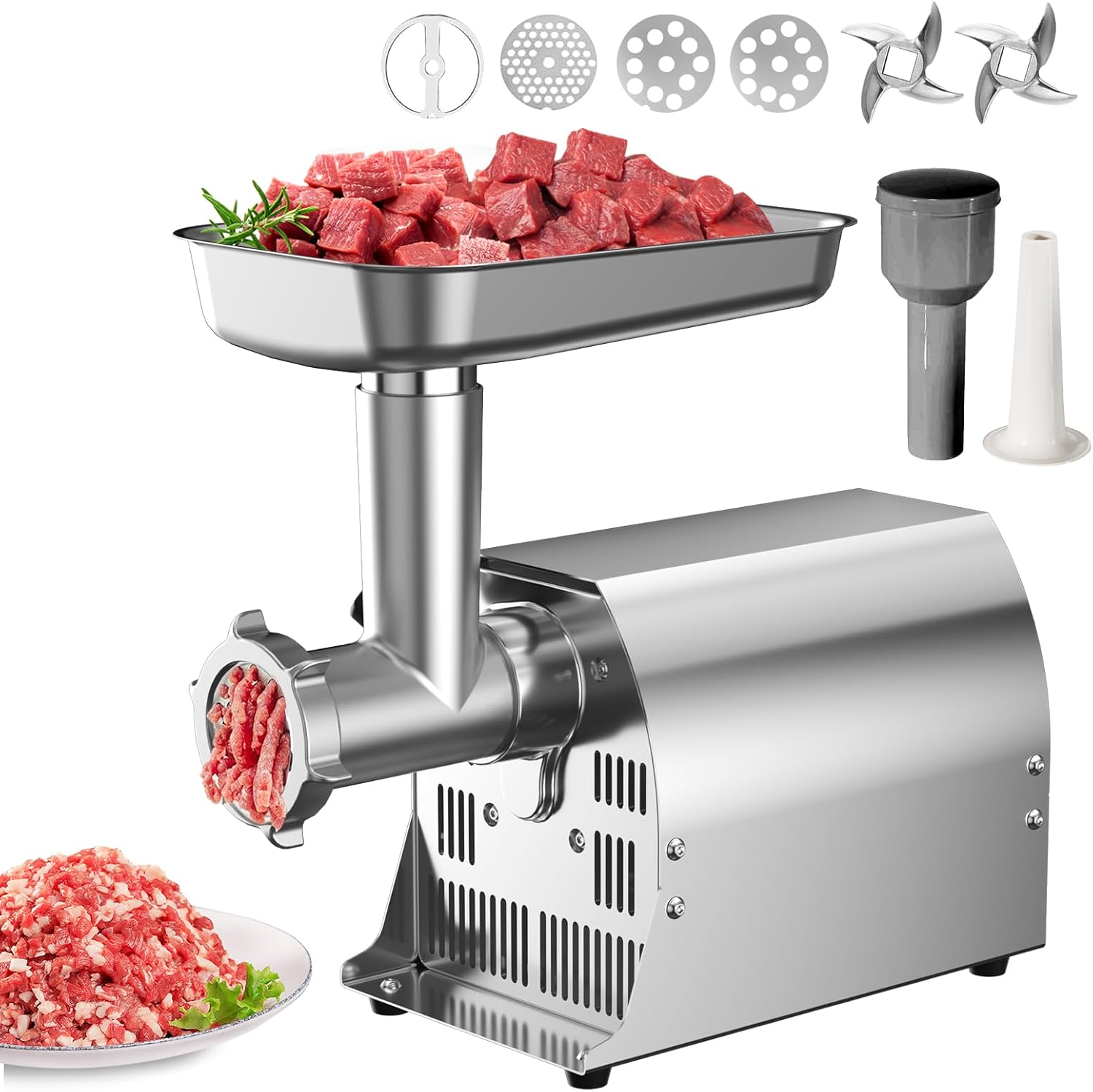| Included Components | Meat tray, head assembly, blade disc, meat stomper, sausage stuffer |
