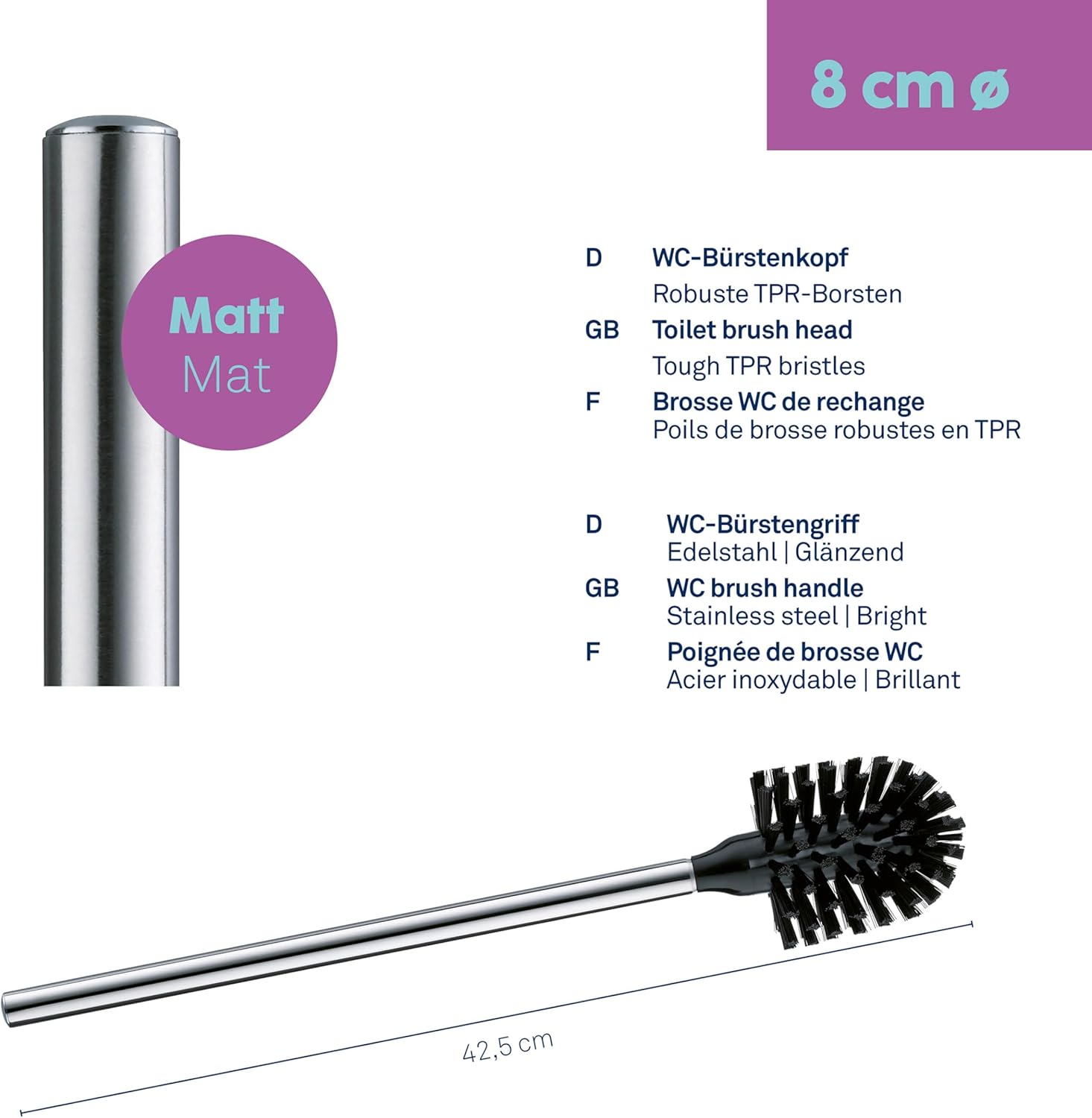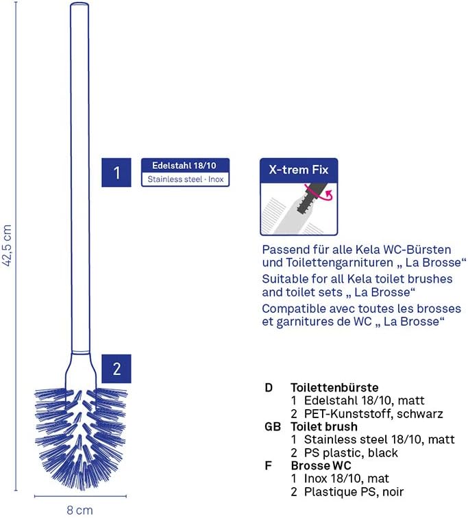 The quality had absolute priority in the development and design of the toilet brush La Brosse. Sturdiness: The perfect thread - with a self-locking mechanism - prevents the brush head from the handle loosens during use or triggers. Sustainability: The bristles are made of high quality, recyclable PET material and are stamped with a special stainless steel wire. Style: Up-to-date design and selected materials make the La Brosse a Kela quality product. One for all: The nerve-racking search to find the right replacement toothbrush is over. In the future, there is only one thread system and a diameter for all toilet sets of Kela. The statements The La Brosse Brush is available in eight different versions: the separate brush heads in black (Art. 20141) or white (Art. 20140) the coating with a plastic handle in black (Art. 20143) or white (Art. 20142) the elegant stainless steel handle 18/10 matt black or white brush head (Art. 20146 white, Art. 20147 black) the elegant stainless steel handle 18/10 glossy black or white brush head (Art. 20144 white, Art. 20145 black) Better handling: The La Brosse toilet brush is 45.5 cm considerably longer than ordinary toilet brushes. CAUTION: The La Brosse brush will only fit Kela toilet sets with the La Brosse symbol on the packaging. Not suitable for older toilet brush sets.