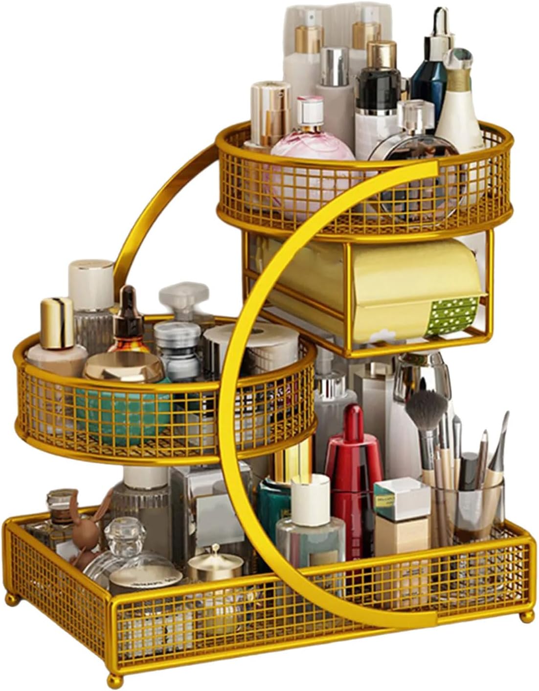 Features: Effortlessly organize your items with this portable, without installation metal makeup storage rack designs to maximizes countertop space for lipsticks, skincare items, and beauty tool. Its multiple tiers varnished metal construction offer sturdy storage with multiple shelves for vertical organization of perfumes, cosmetics, and accessories. Ideal for beauty enthusiasts and busy professional seek tidying countertop organizers that blend functionality with most home decoration aesthetic. Fit seamlessly on dressers, bathroom or bedroom countertops as space saving cosmetic shelf for daily skincare routines and makeup application stations. The metallic finish enhances any interior styles while keep items visible and accessible for maintaining tidying space. Specifications: Component: Metal Size: 32x19x35cm/12.6x7.48x13.78inch Color: Gold/Black/White note: 1.Please allow 1-2cm errors due to manual measurement, making sure that you will not mind before order. 2.Due to the differences between different monitors, the picture may not reflect the actual color. Package Includes: 1pc Countertop Organizers