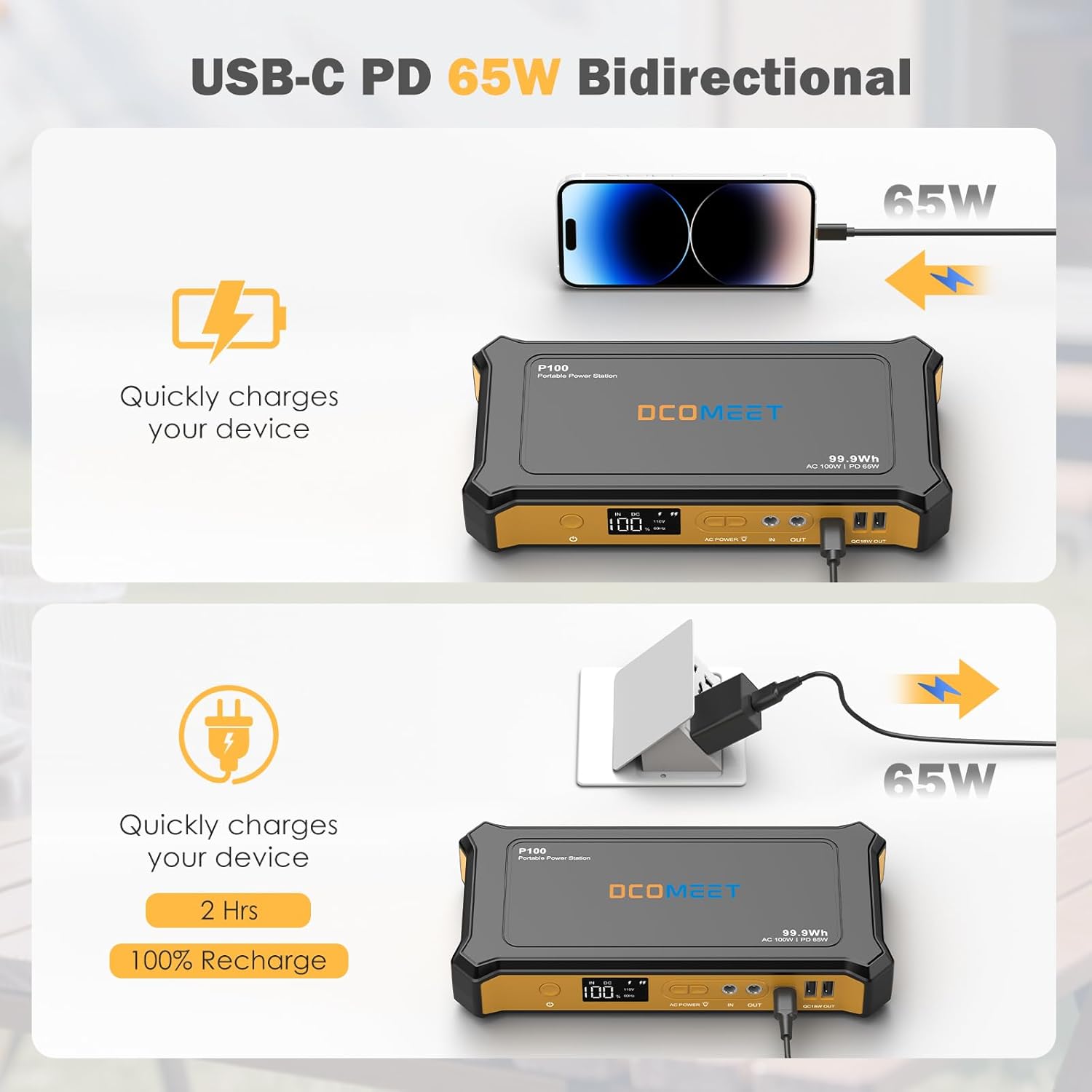 | Other Special Features of the Product | Camping Power Bank with LED Flashlight/emergency light/mini fridge, Portable Charger with PD 65W USB C charging for iphone/ipad, Portable Laptop Charger with DC output(12V/6A,8A Max), Portable Power Station 99wh/27000mAh, Portable Power bank with AC Outlet(110V/100W)for laptops drone christmas tree led lights |